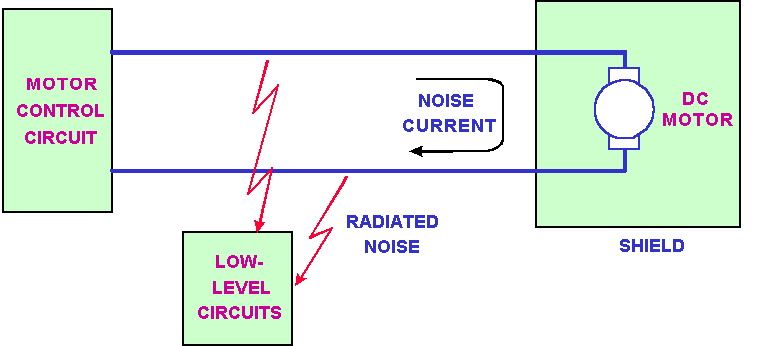 了解噪音如何傳輸有助于辨識(shí)電路內(nèi)部的電磁干擾問(wèn)題。噪音的發(fā)生必需要有來(lái)源(source)、藕合路徑(couplingpath)以及易感染的接收器(susceptiblereceptor)[Ott,1988],這三者必需一起出現(xiàn)才會(huì)有EMI問(wèn)題的存在,圖1說(shuō)明EMI如何以藕合方式進(jìn)入一個(gè)系統(tǒng)。因此,若是三者之一被排除于系統(tǒng)之外或被減少,干擾才會(huì)消失或降低。圖1是以馬達(dá)控制為例的EMI說(shuō)明,其中功率級(jí)至馬達(dá)的線圈電流是產(chǎn)生EMI的來(lái)源,控制器的低階信號(hào)(數(shù)位或類比信號(hào))是易受干擾的接收器,藕合路徑則可能是經(jīng)由傳導(dǎo)方式(經(jīng)由電源或地線)或輻射方式。