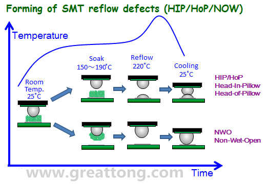 上圖將NWO(Non-Wet-Open)與HIP(Head-In-Pillow)或HoP(Head-of-Pillow)在SMT的Reflow溫度曲線下形成的原因稍微做了解釋,基本上兩者都是因?yàn)榘宀淖冃嗡?,只是HIP的錫膏會保留在電路板的焊墊上,但NWO則完全轉(zhuǎn)移到了錫球。
